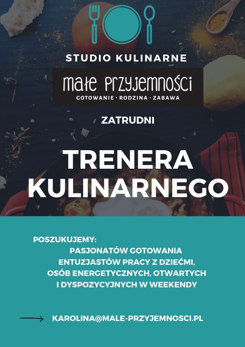 - Praca w profesjonalnie wyposażonym studiu kulinarnym. Prowadzenie warsztatów dla dzieci w różnym wieku, a także współprowadzenie spotkań kulinarnych dla osób dorosłych. Warsztaty odbywają się głównie w weekendy i wieczorami w dni powrzednie, istnieje możliwość dostosowania grafiku.